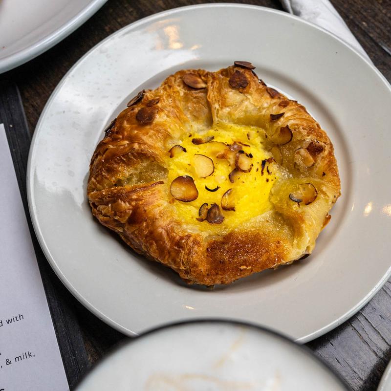 Prosciutto and brie toasted on a house baked butter croissant drizzled with honey
